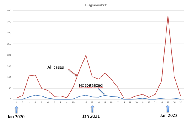 Den blå linjen visar antalet sjukhusvårdade patienter per månad. Den röda linjen visar antalet patienter som insjuknat i Covid-19 per månad. Som synes i januari 2022 högsta toppen av insjuknade patienter men få sjukhusvårdade. (Data från MS-registret)